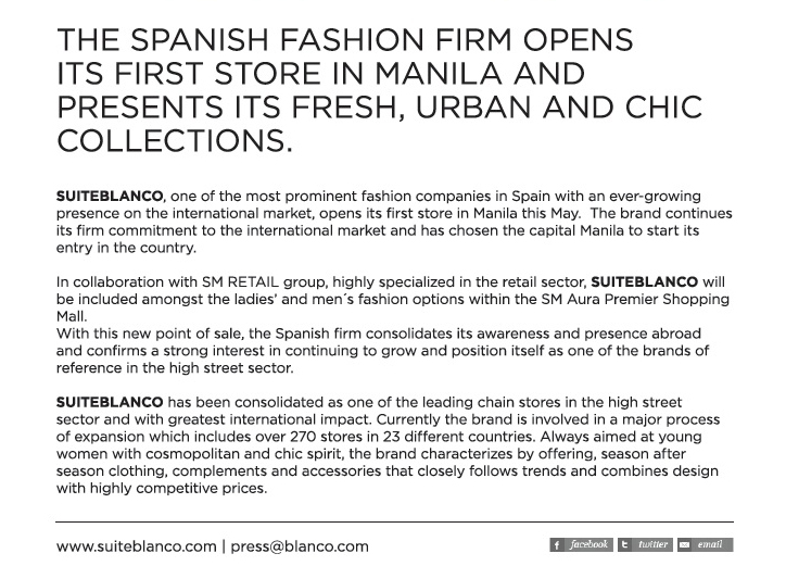 SUITEBLANCO speaks to young, modern women and men with an uninhibited urban spirit. The clothes and accessories resonate well with consumers, who aspire for a diverse worldview on fashion that is aspirational and attainable in terms of price. This market segment is constantly clamoring for novelty and variety and we recognize the need to deliver such demands.
